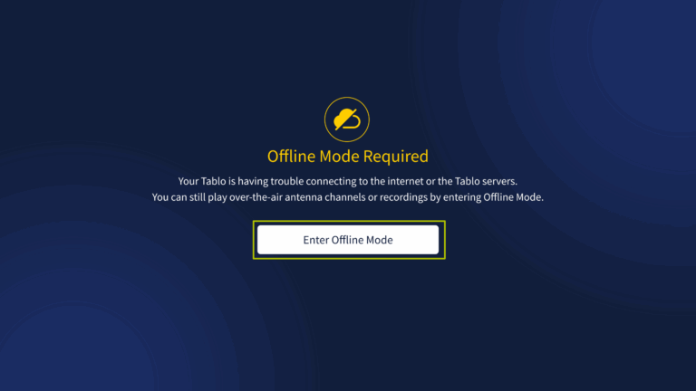 If your external internet access is fine but Tablo prompts you to enter Offline Mode, the Tablo servers are likely experiencing an issue. Whether it is an unplanned or a planned server maintenance period, you’ll still be able to enjoy OTA TV and your recorded shows, thanks to Offline Mode.