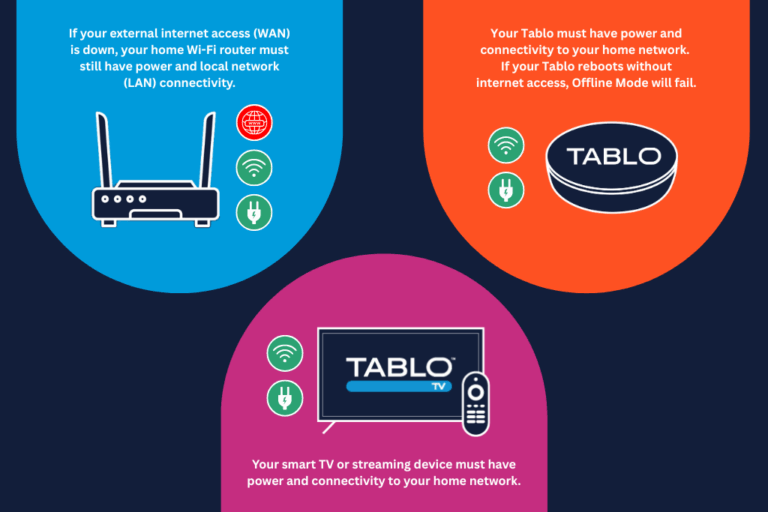 Now with Offline Mode, if you have power and your home Wi-Fi router can provide an active local network connection (LAN) between your Tablo and your streaming devices or smart TVs, you can still access live local broadcasts and previously recorded programming.