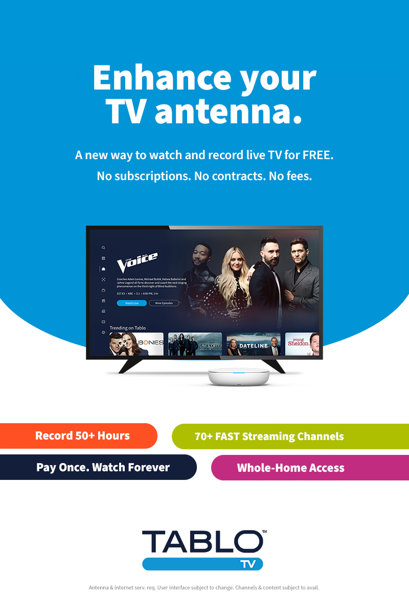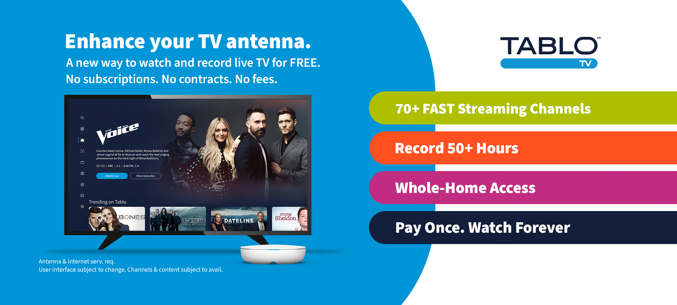 Buy once & enjoy free TV forever — Tablo has no contracts, subscriptions or monthly fees. Internet service required.